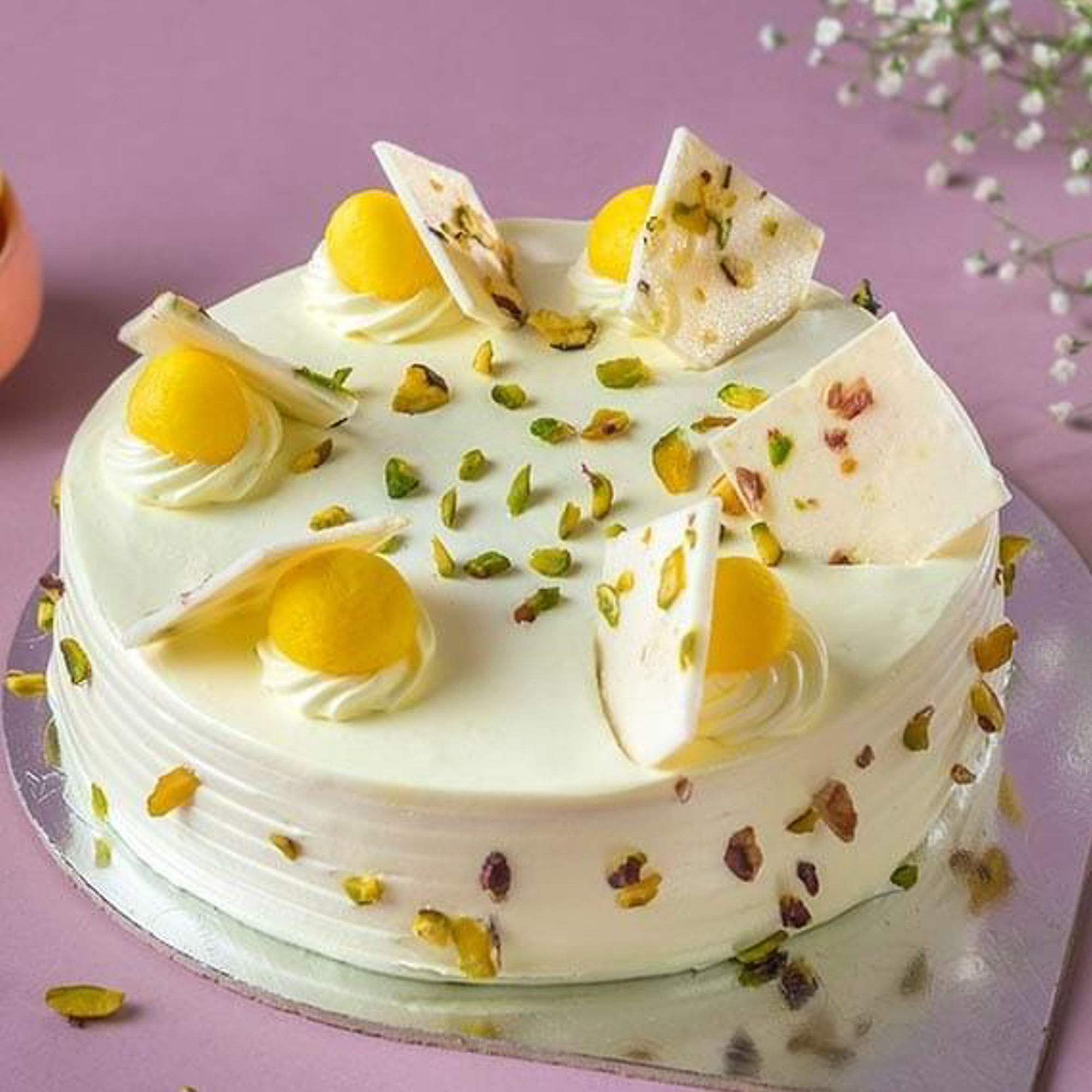 The cake is decorated with cream swirls, dry fruits, and rasmalai pieces on top, giving it a regal look that matches its taste. The balance of sweetness, creaminess, and soft sponge makes this cake perfect for those who want something rich yet light at the same time.